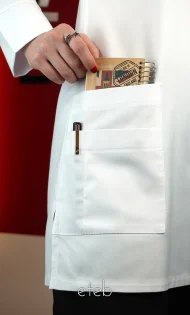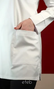 - طراحی حرفهای: یقه کلاسیک، آستینهای بلند با امکان تنظیم طول، و برش ارگونومیک متناسب با فرم بدن بانوان برای ظاهری شیک و حرفهای.
