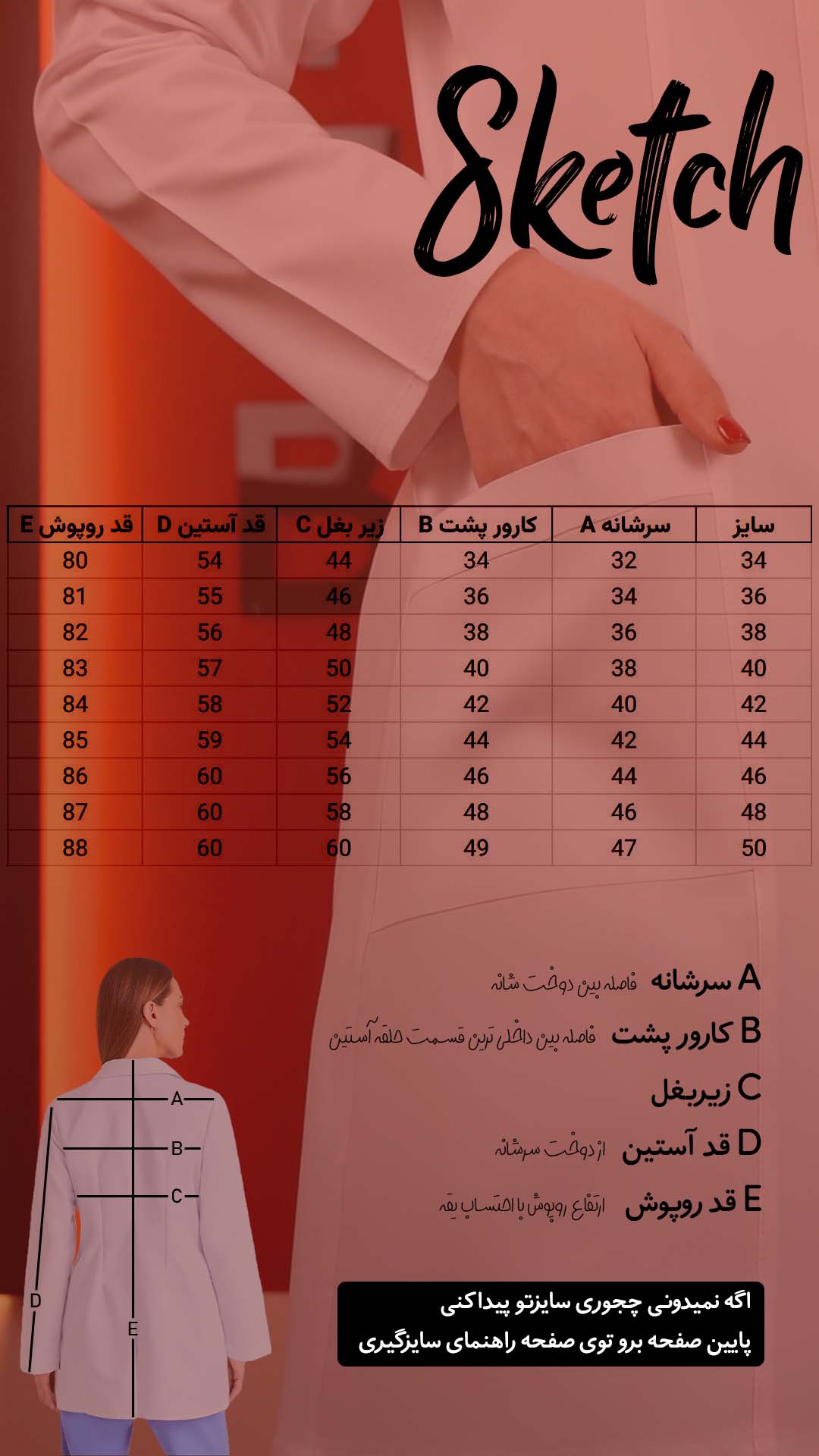 تونیک زنانه اسکِچ در سایزهای 34 تا 50 عرضه میشود. برای انتخاب دقیق سایز، از راهنمای اندازهگیری موجود در وبسایت ایطب استفاده کنید. برای سفارش سایزهای بزرگتر یا سفارشی، با تیم پشتیبانی تماس بگیرید.