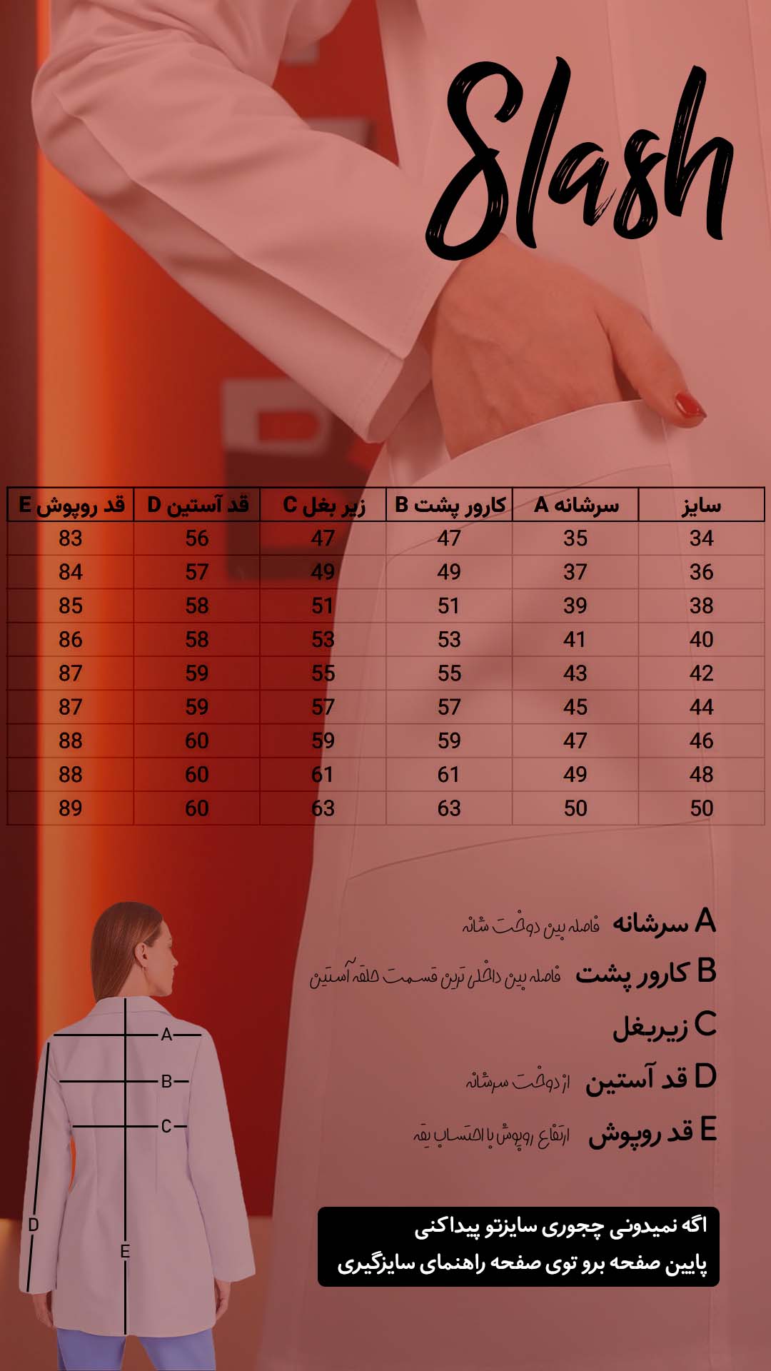 روپوش زنانه اسلش در سایزهای 36 تا 50عرضه میشود. برای انتخاب دقیق سایز، از راهنمای اندازهگیری موجود در وبسایت ایطب استفاده کنید. برای سفارش سایزهای بزرگتر یا سفارشی، با تیم پشتیبانی تماس بگیرید.